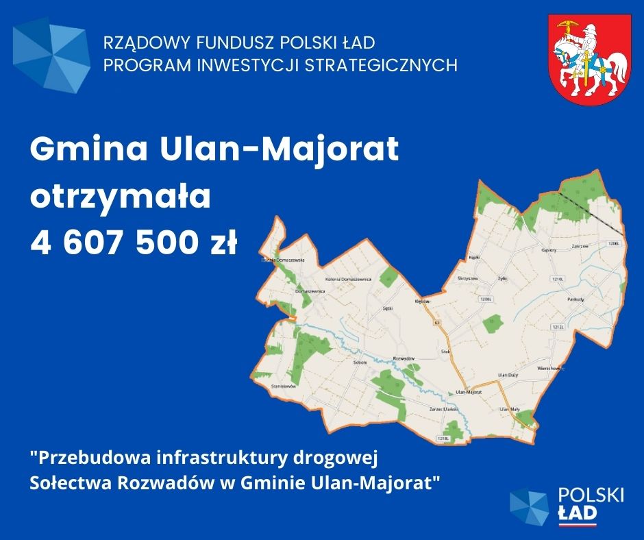 Gmina Ulan-Majorat otrzymała dotację z Rządowego Funduszu Polski Ład w kwocie 4 607 500 zł na „Przebudowę infrastruktury drogowej w Sołectwie Rozwadów w Gminie Ulan-Majorat”.