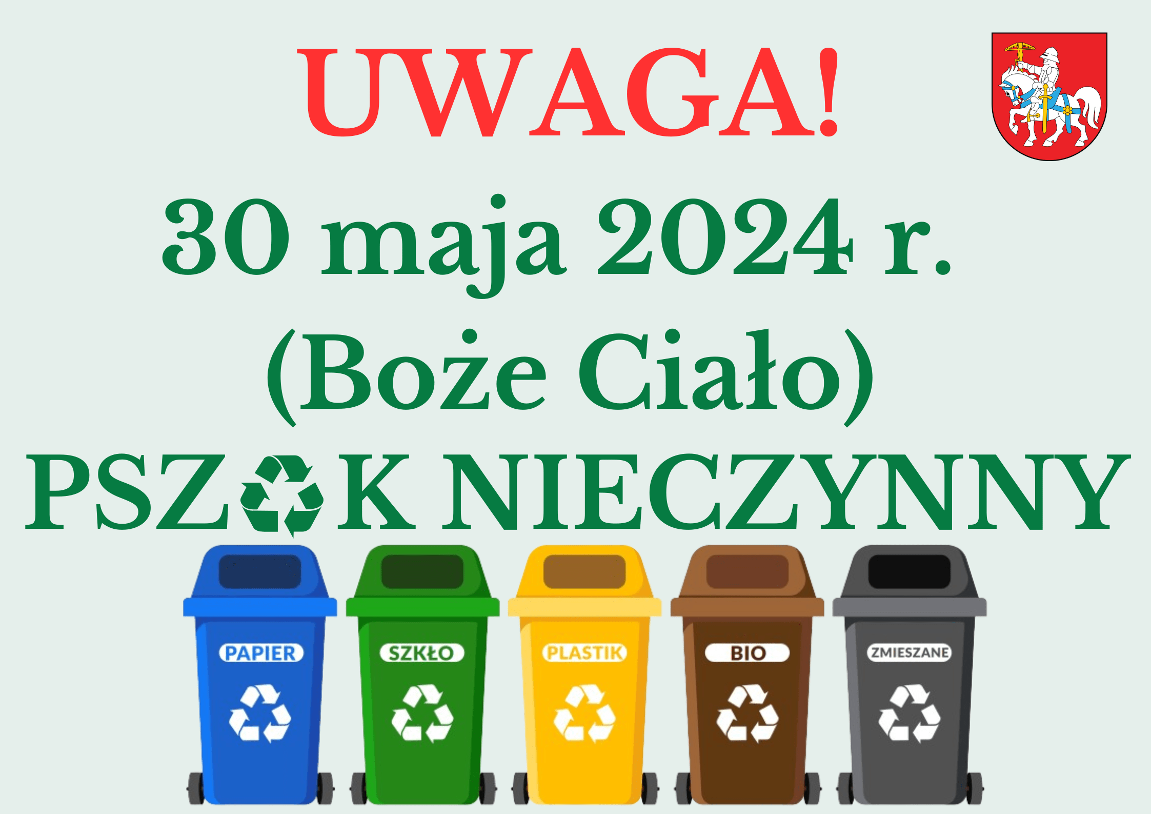 30 MAJA 2024 r. PUNKT SELEKTYWNEJ ZBIÓRKI ODPADÓW KOMUNALNYCH – NIECZYNNY