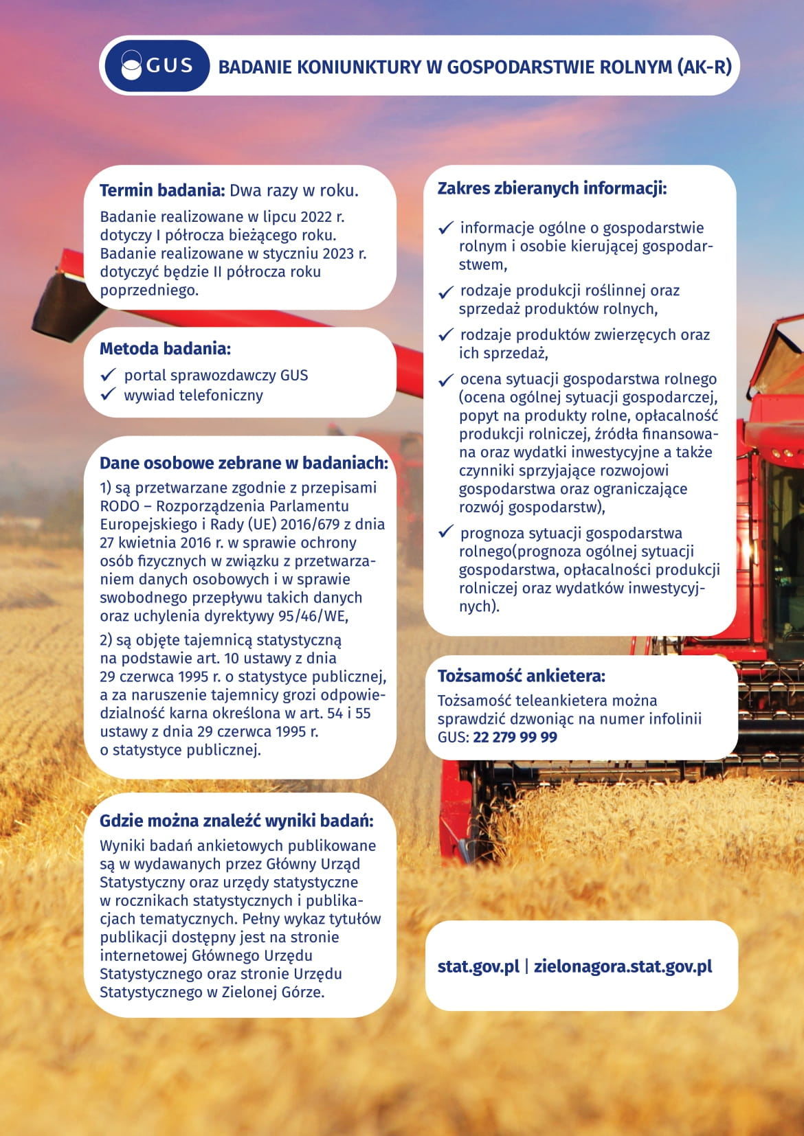 W dniach od 15 do 29 lipca br. na terenie całej Polski zostanie przeprowadzone Badanie Koniunktury w Gospodarstwach Rolnych (AK-R). Badanie prowadzone jest cyklicznie, dwa razy w roku, tj. w styczniu i lipcu, a jego wyniki prezentowane są odpowiednio we wrześniu danego roku i marcu roku następnego. Badanie dostarcza informacji o tym jak rolnicy oceniają przeszłą (poprzednie półrocze) i bieżącą koniunkturę w gospodarstwach rolnych oraz prognozują jej zmiany w następnym półroczu, w tym m.in. pokazuje opłacalność produkcji rolnej czy aktualny popyt na produkty rolne. Informacje te są niezbędne do podejmowania decyzji o kierunkach rozwoju rolnictwa na poziomie kraju, województwa, ale także każdej gminy. Uczestnictwo jak największej liczby osób w badaniu jest kluczowe dla jego efektywności. Dlatego zależy nam na zaangażowaniu osób cieszących się zaufaniem społecznym w gminie w popularyzację badania. Jest dla nas niezmiernie ważne, aby nasi respondenci byli jak najlepiej poinformowani o prowadzonym badaniu, jego celu, metodach i bezpieczeństwie.