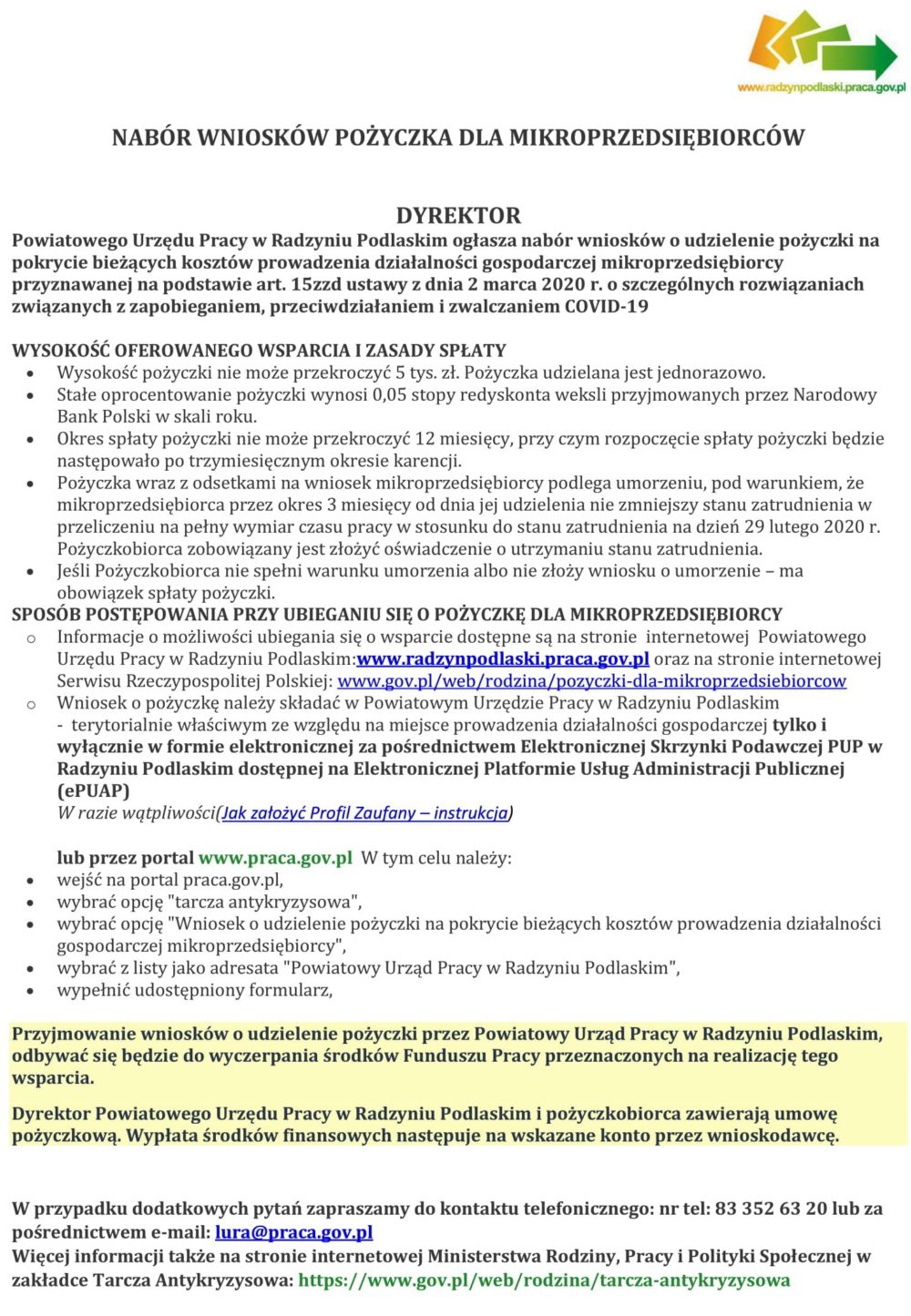 INFORMACJA POWIATOWEGO URZĘDU PRACY W RADZYNIU PODLASKIM DOTYCZĄCA FORM WSPARCIA DLA PRZEDSIĘBIORCÓW