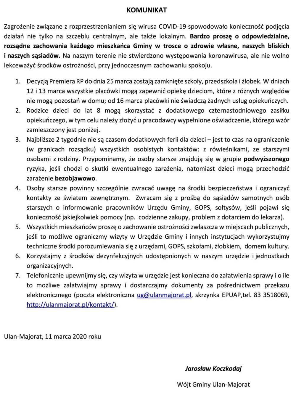KOMUNIKAT WÓJTA GMINY ULAN-MAJORAT