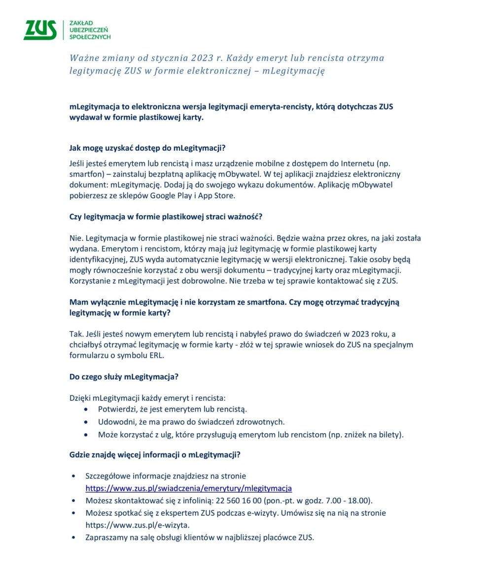 Od stycznia 2023 roku każdy nowy emeryt lub rencista będzie otrzymywał legitymację emeryta-rencisty w formie elektronicznej. Dotychczas były to plastikowe karty. Wystawianie przez ZUS tego dokumentu w formie cyfrowej wynika z przepisów. Dlatego Zakład Ubezpieczeń Społecznych prowadzi kampanię informacyjną w sprawie mLegitymacji.