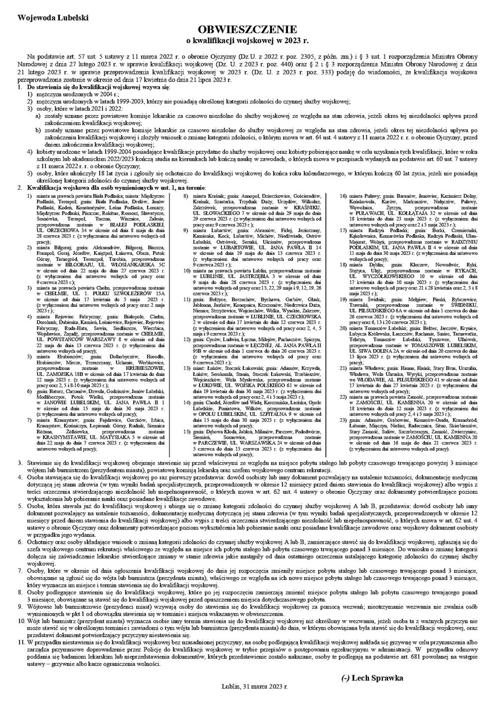 Na podstawie art. 57 ust. 5 ustawy z 11 marca 2022 r. o obronie Ojczyzny (Dz.U. z 2022 r. poz. 2305, z późn. zm.) i § 3 ust. 1 rozporządzenia Ministra Obrony Narodowej z dnia 27 lutego 2023 r. w sprawie kwalifikacji wojskowej (Dz. U. z 2023 r. poz. 440) oraz § 2 i § 3 rozporządzenia Ministra Obrony Narodowej z dnia 21 lutego 2023 r. w sprawie przeprowadzenia kwalifikacji wojskowej w 2023 r. (Dz. U. z 2023 r. poz. 333), kwalifikacja wojskowa przeprowadzona zostanie w okresie od dnia 17 kwietnia do dnia 21 lipca 2023 r.