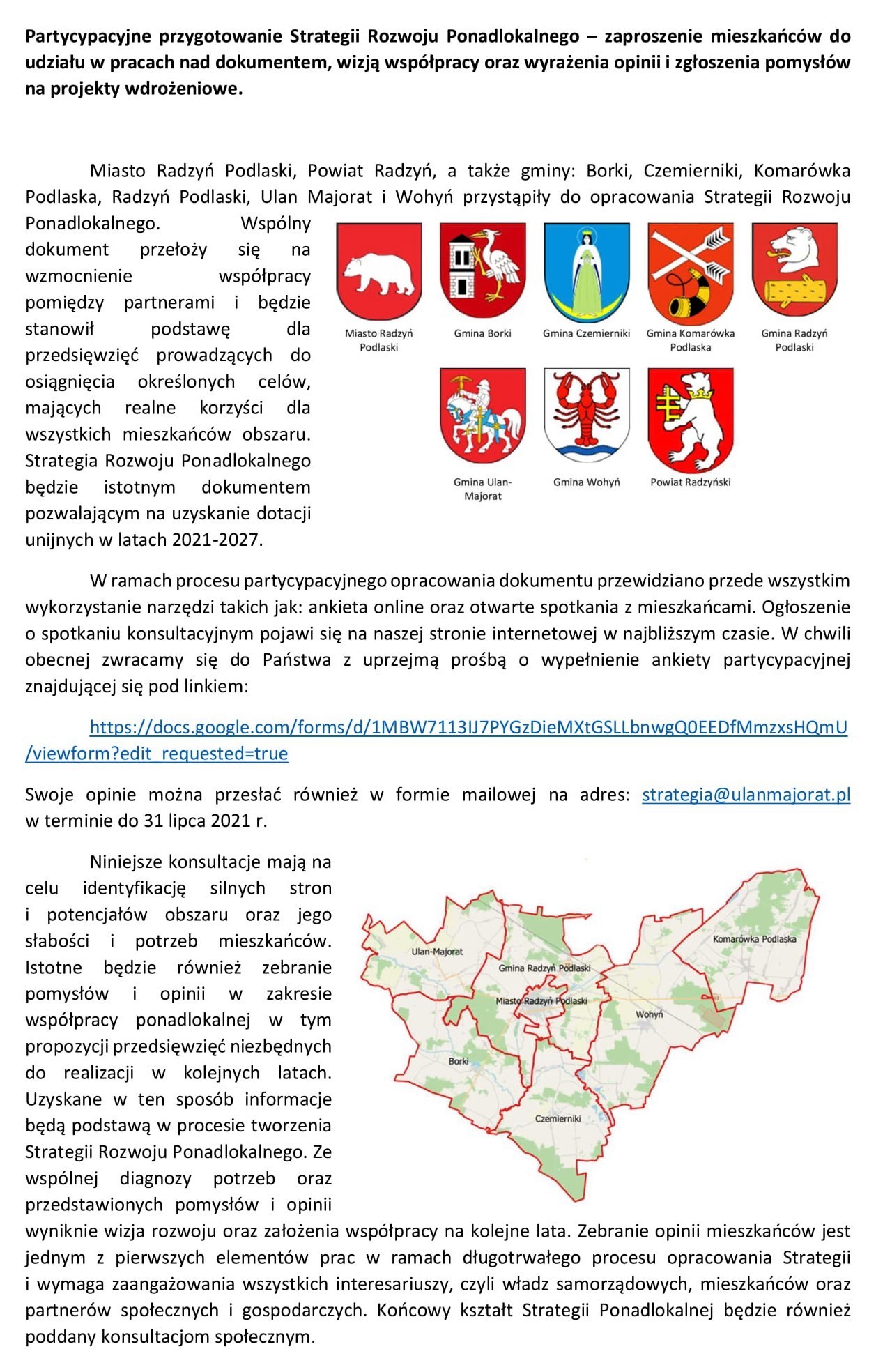 Partycypacyjne przygotowanie Strategii Rozwoju Ponadlokalnego – zaproszenie mieszkańców do udziału w pracach nad dokumentem, wizją współpracy oraz wyrażenia opinii i zgłoszenia pomysłów na projekty wdrożeniowe.