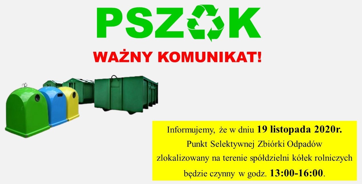 Informujemy, że w dniu 19 listopada 2020 r. Punkt Selektywnej Zbiórki Odpadów zlokalizowany na terenie spółdzielni kółek rolniczych będzie czynny w godz. 13:00-16:00.