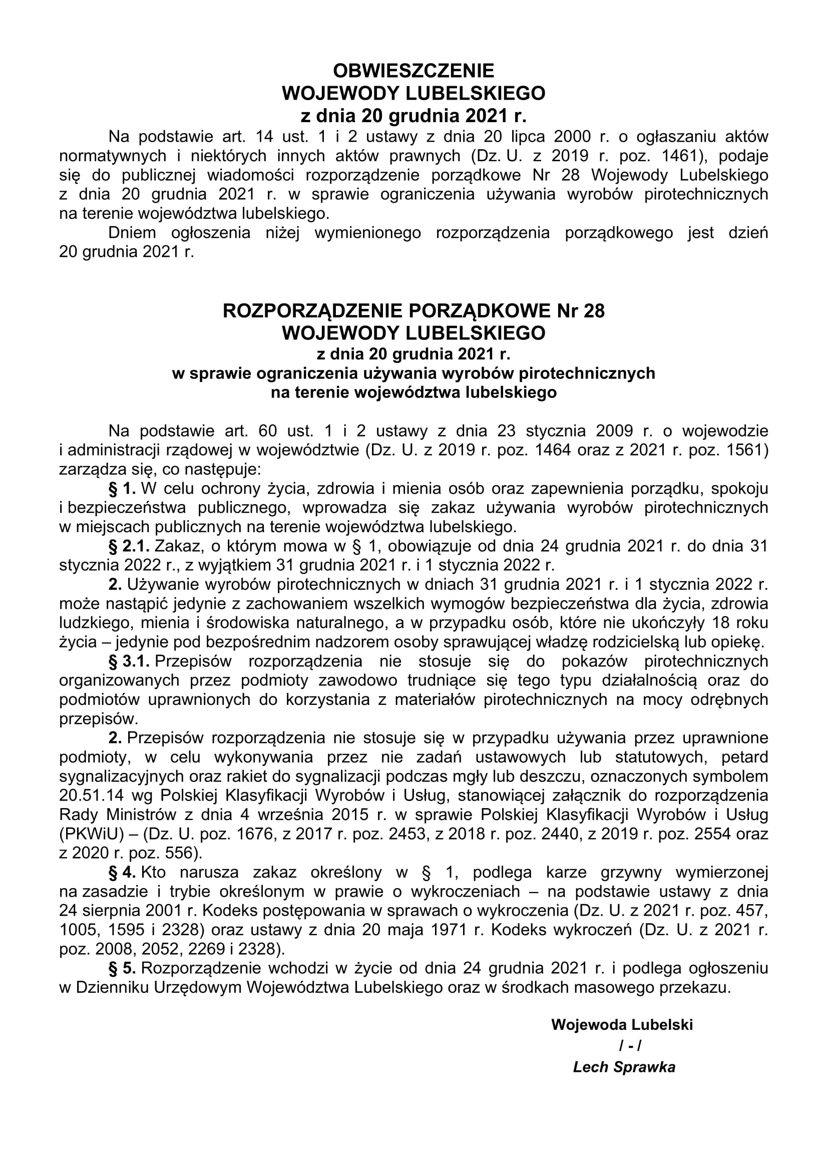 Rozporządzenie porządkowe nr 28 Wojewody Lubelskiego z dnia 20 grudnia 2021 r. w sprawie ograniczenia używania wyrobów pirotechnicznych na terenie województwa lubelskiego.