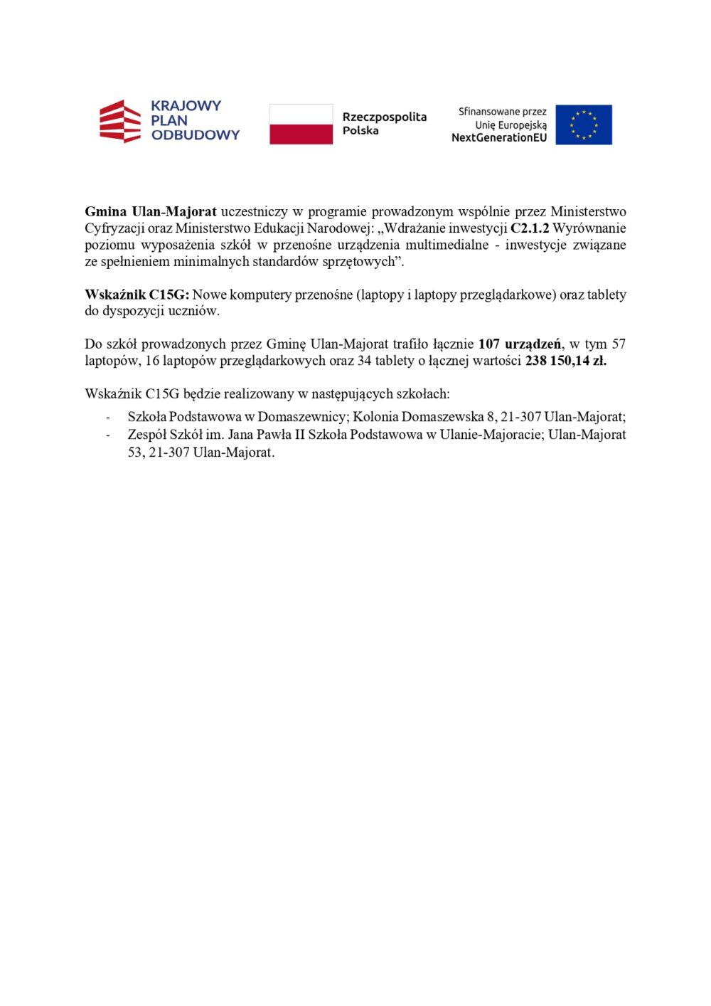 Sprzęt trafił do Szkoły Podstawowej w Domaszewnicy i Zespołu Szkół im. Jana Pawła II w Ulanie-Majoracie. We współczesnym świecie edukacja odbywa się za pomocą nowoczesnych urządzeń, które stanowią dziś podstawowe narzędzia pracy nauczyciela i ucznia. Nasze szkoły są bardzo dobrze wyposażone w zakresie technologii informacyjno-komunikacyjnych, ale staramy się wykorzystywać wszelkie dostępne źródła, aby unowocześniać sprzęt i doskonalić umiejętności kadry pedagogicznej. Wysokie kompetencje nauczyciela, urządzenia techniczne o odpowiednim standardzie, troska o bezpieczeństwo ucznia w Internecie to zagadnienia, które w Gminie Ulan-Majorat są traktowane priorytetowo.