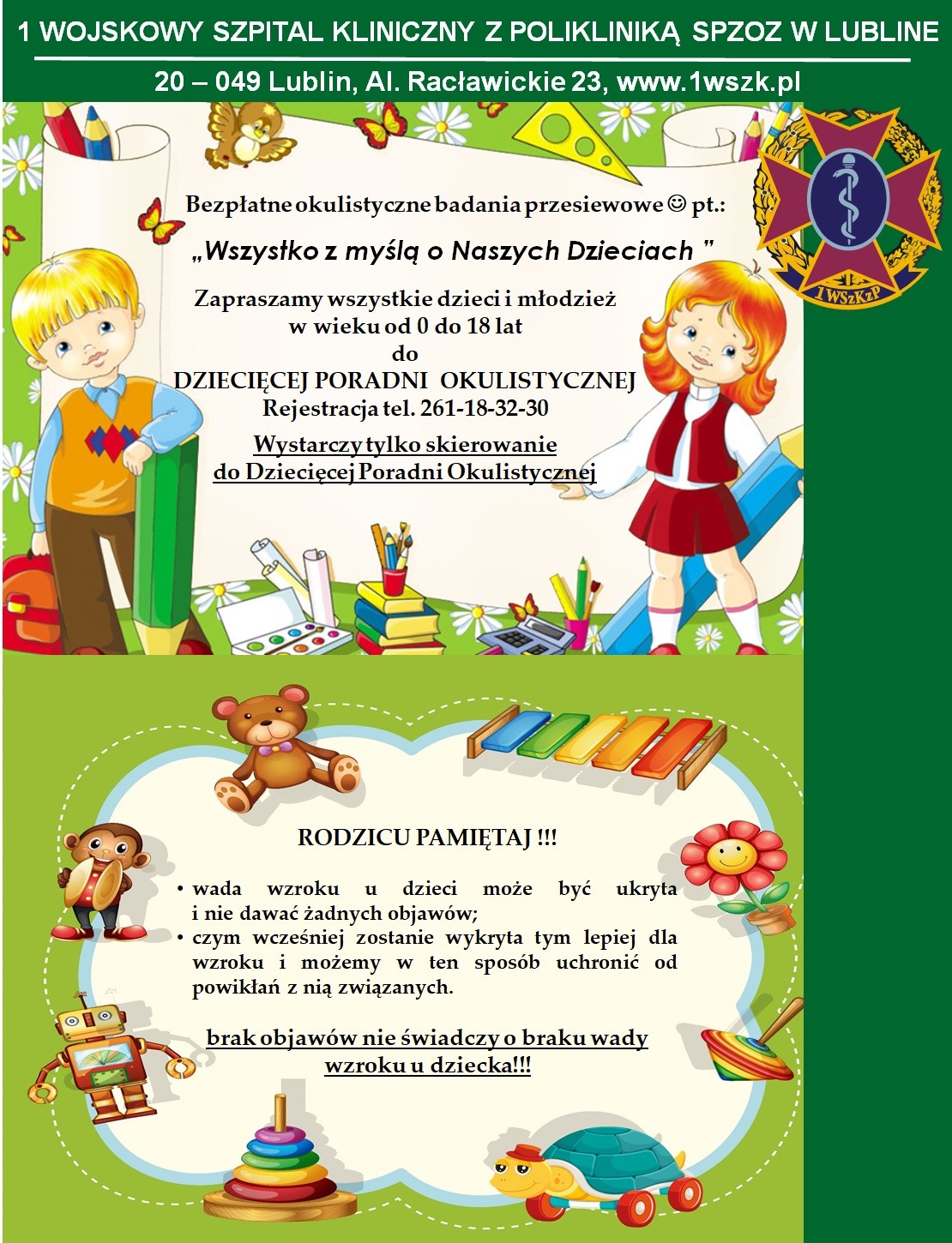 Informacja dotycząca możliwości korzystania z usług medycznych, a także konsultacji lekarskich oraz wykonania podstawowych badań w 1 Wojskowym Szpitalu Klinicznym z Polikliniką SPZOZ w Lublinie.