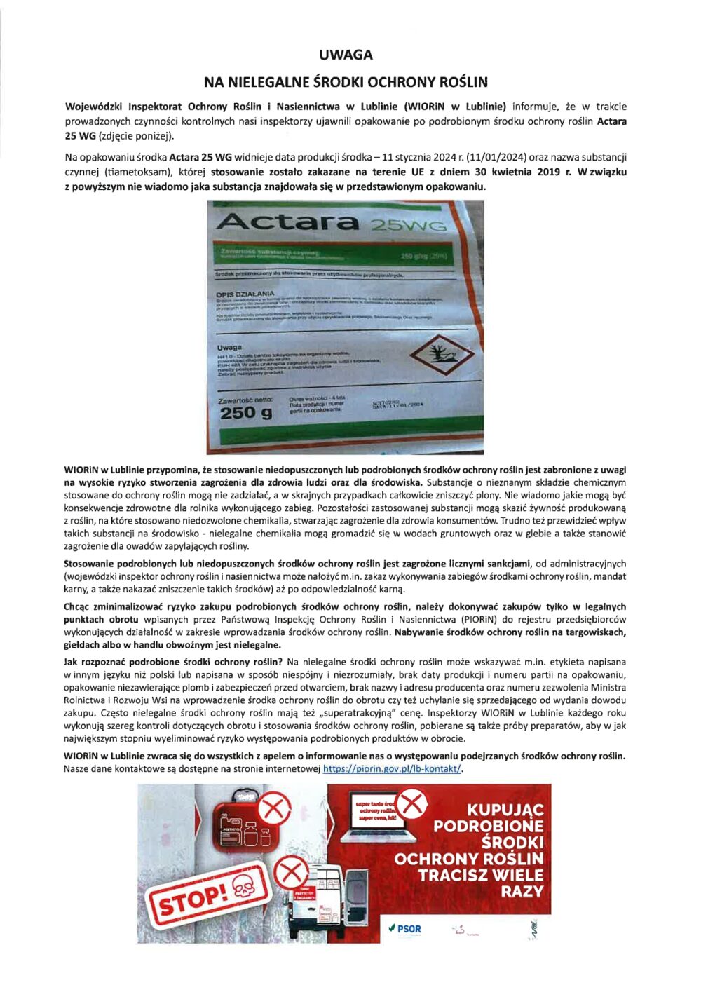 Informacja Wojewódzkiego Inspektoratu Ochrony Roślin i Nasiennictwa w Lublinie dotycząca nielegalnych środków ochrony roślin.