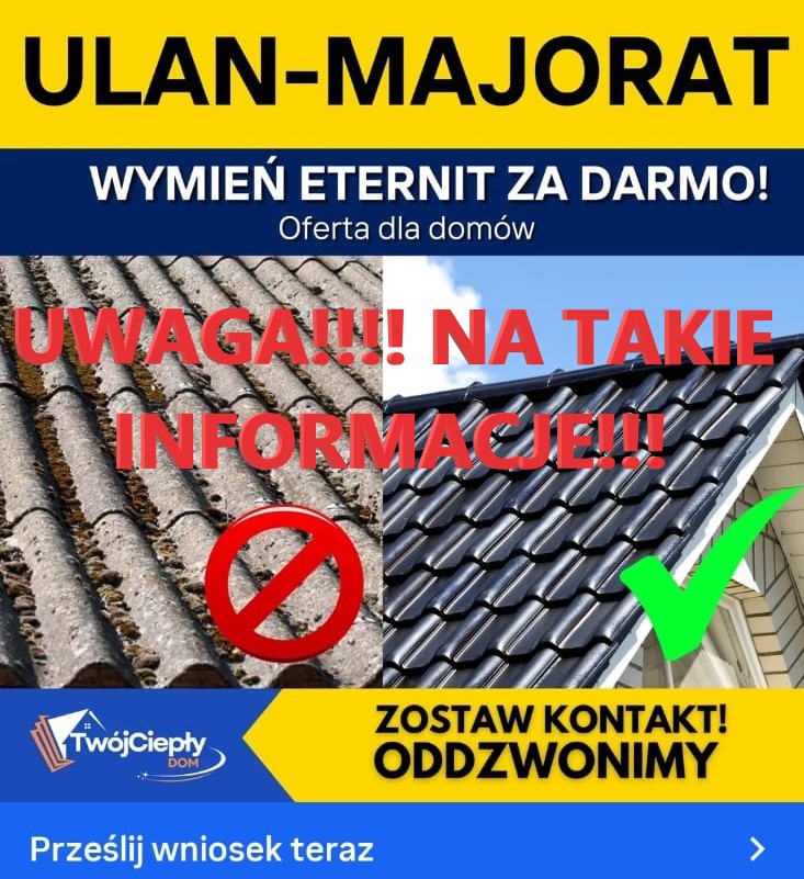 W związku z pojawiającymi się sygnałami od Mieszkańców Gminy Ulan-Majorat w sprawie wymiany eternitu oraz bezpłatnych audytów nieruchomości i inwestycji w odnawialne źródła energii (OZE) na terenach prywatnych informujemy, że żadne podmioty: firmy bądź osoby prywatne, nie są upoważnione do przekazywania jakichkolwiek informacji oraz powoływania się, reprezentowania, działania w imieniu Gminy Ulan-Majorat.
