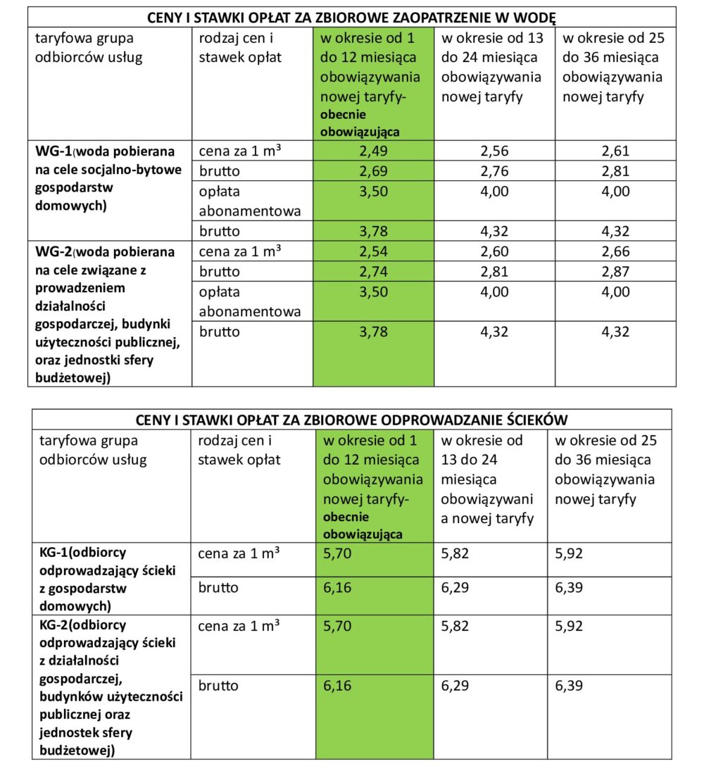 Konieczność ustalenia nowej taryfy wynika z upływu okresu trwania dotychczasowej. Nowa taryfa będzie obowiązywać przez kolejne 3 lata. Ustalając ceny, Gmina zawsze ma na uwadze dobro jej mieszkańców, dążąc do realizacji usług na jak najwyższym poziomie. Oznacza to także gotowość do świadczenia usług typu: konserwacja sieci, zapewnienie wymiany i odczytu wodomierzy, obsługa należności za wodę i ścieki.